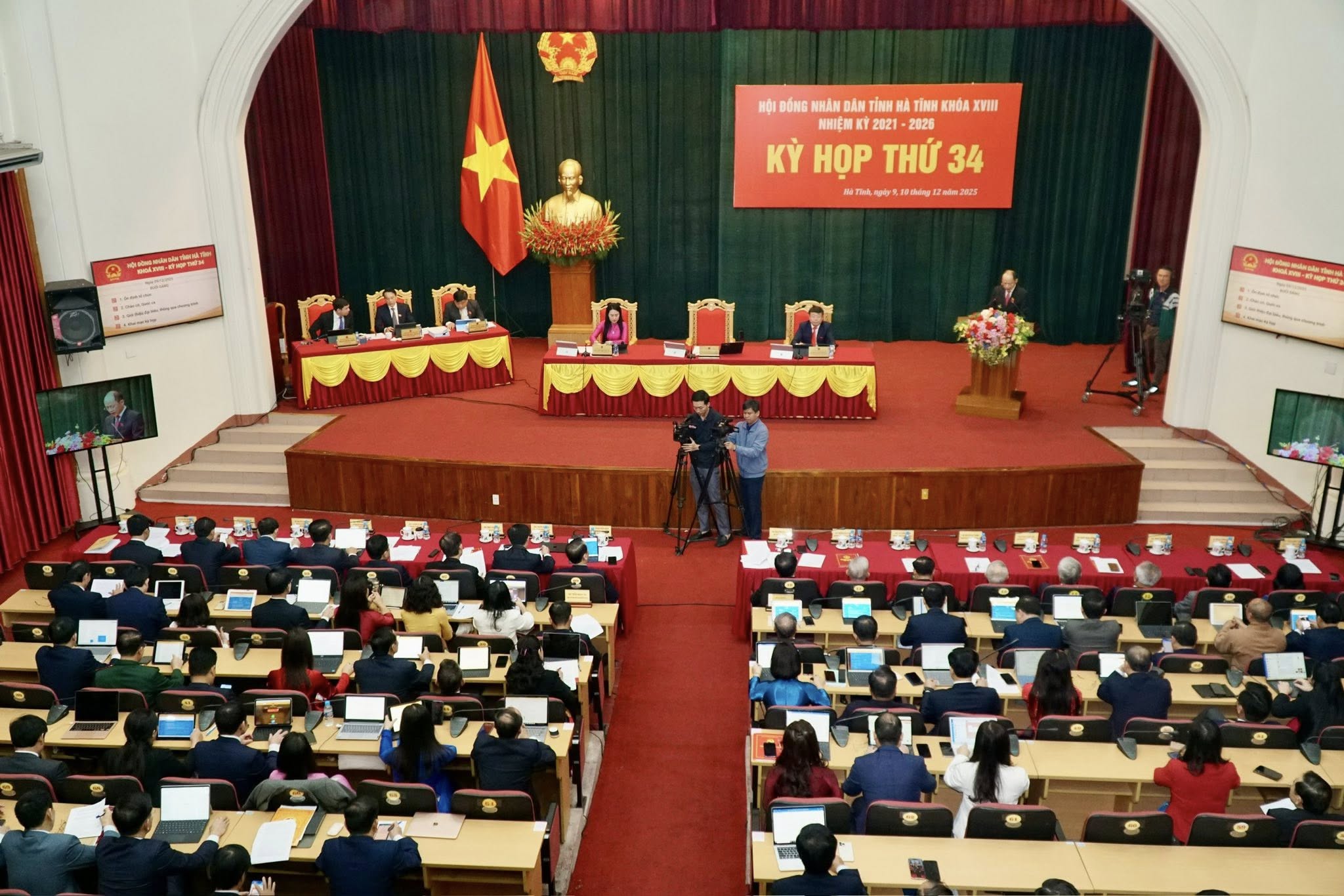 Tham dự kỳ họp có Bí thư Tỉnh ủy Nguyễn Duy Lâm; Phó Bí thư Tỉnh ủy, Chủ tịch UBND tỉnh Phan Thiên Định; các đồng chí nguyên lãnh đạo tỉnh; Ủy viên Ban Thường vụ Tỉnh ủy, lãnh đạo HĐND, UBND, Ủy ban MTTQ Việt Nam tỉnh; đại biểu HĐND tỉnh khóa XVIII.Phó Bí thư Thường trực Tỉnh ủy, Chủ tịch HĐND tỉnh Nguyễn Hồng Lĩnh; Phó Chủ tịch Thường trực HĐND tỉnh Dương Tất Thắng; Phó Chủ tịch HĐND tỉnh Nguyễn Thị Việt Hà chủ tọa kỳ họp.Chủ toạ kỳ họp Phát biểu khai mạc kỳ họp, đồng chí Nguyễn Hồng Lĩnh - Phó Bí thư Thường trực Tỉnh ủy, Chủ tịch HĐND tỉnh nhấn mạnh: Kỳ họp thường lệ cuối năm 2025 là kỳ họp có ý nghĩa quan trọng trong bối cảnh toàn tỉnh đang tập trung hoàn thiện cơ chế, chính sách và triển khai các nhiệm vụ trọng tâm nhằm cụ thể hóa mục tiêu phát triển theo Nghị quyết Đại hội Đảng bộ tỉnh và yêu cầu của giai đoạn phát triển mới.Kỳ họp lần này có khối lượng công việc rất lớn, nội dung toàn diện, bao quát hầu hết các lĩnh vực. Trong đó xem xét, đánh giá tình hình kinh tế - xã hội, quốc phòng - an ninh năm 2025; thảo luận và quyết nghị nhiệm vụ, giải pháp phát triển năm 2026 và giai đoạn 2026-2030; thảo luận, xem xét và quyết nghị nhiều cơ chế, chính sách quan trọng; thực hiện hoạt động chất vấn và trả lời chất vấn đối với những vấn đề được cử tri và Nhân dân quan tâm. Kỳ họp cũng xem xét việc miễn nhiệm, bầu bổ sung Ủy viên UBND tỉnh và thực hiện một số nội dung quan trọng khác theo thẩm quyền.Đồng chí Nguyễn Hồng Lĩnh - Phó Bí thư Thường trực Tỉnh ủy, Chủ tịch HĐND tỉnh khai mạc kỳ họpĐồng chí Nguyễn Hồng Lĩnh đề nghị các vị đại biểu HĐND tỉnh phát huy cao nhất tinh thần trách nhiệm, dân chủ và trí tuệ; tập trung thực hiện tốt việc ứng dụng hệ thống số phục vụ cho kỳ họp; nghiên cứu kỹ các báo cáo, tài liệu; phân tích khách quan, toàn diện kết quả đạt được; thẳng thắn chỉ rõ các tồn tại, hạn chế và nguyên nhân; đồng thời đóng góp nhiều ý kiến tâm huyết, xác đáng, đề xuất các giải pháp khả thi, có tầm nhìn, góp phần vào sự thành công của kỳ họp và sự phát triển của tỉnh trong thời gian tới. Đồng thời mong muốn cử tri quan tâm theo dõi và tích cực gửi ý kiến, góp ý, góp phần nâng cao chất lượng quyết nghị của HĐND tỉnh.Các đại biểu tham dự kỳ họp Ngay sau khai mạc, Phó Chủ tịch Thường trực UBND tỉnh Trần Báu Hà đã báo cáo tóm tắt tình hình kinh tế - xã hội năm 2025; kế hoạch phát triển kinh tế - xã hội năm 2026 và kế hoạch phát triển kinh tế - xã hội giai đoạn 2026-2030.Phó Chủ tịch Thường trực UBND tỉnh Trần Báu Hà nhấn mạnh, năm 2025, trong bối cảnh nhiều khó khăn, thách thức và khối lượng nhiệm vụ lớn, nhưng với tinh thần đoàn kết, sự lãnh đạo sát sao của Tỉnh ủy, điều hành linh hoạt của chính quyền, sự phối hợp của các ngành, giám sát của HĐND tỉnh và sự đồng thuận của Nhân dân, doanh nghiệp, Hà Tĩnh vẫn duy trì ổn định và đạt kết quả tích cực.Trong 28 chỉ tiêu kinh tế - xã hội chủ yếu, dự kiến có 23 chỉ tiêu đạt và vượt kế hoạch. GRDP ước tăng 8,78%, đứng đầu khu vực Bắc Trung Bộ; công nghiệp tiếp tục phục hồi (IIP tăng gần 7%); các dự án trọng điểm được đẩy nhanh; nông nghiệp, xây dựng NTM, đô thị văn minh đạt nhiều kết quả nổi bật, toàn tỉnh hoàn thành 8/8 nội dung tiêu chí NTM vào 30/6/2025. Thương mại, dịch vụ, du lịch tăng khá.Phó Chủ tịch Thường trực UBND tỉnh Trần Báu Hà báo cáo tại kỳ họp  Thu ngân sách năm 2025 ước đạt 19.900 tỷ đồng (112% dự toán, tăng 11% so với cùng kỳ); tổng vốn đầu tư toàn xã hội đạt khoảng 56.000 tỷ đồng; giải ngân vốn đầu tư công đến 5/12 đạt gần 7.000 tỷ đồng, vượt 23,6 % kế hoạch Thủ tướng Chính phủ giao, đạt gần 60% kế hoạch địa phương triển khai. Tỉnh chấp thuận chủ trương 43 dự án đầu tư trong nước với tổng vốn gần 120.000 tỷ đồng và 5 dự án FDI với tổng vốn đăng ký 22,9 triệu USD.Lĩnh vực văn hóa - xã hội tiếp tục đạt nhiều thành tích. Chất lượng giáo dục toàn diện và giáo dục mũi nhọn được nâng cao; an sinh xã hội được bảo đảm; tỷ lệ hộ nghèo đa chiều cuối năm 2025 giảm còn dưới 1,9%, hộ cận nghèo còn 2,5%. Tỉnh hoàn thành việc xây mới, sửa chữa 2.281 nhà tạm, dột nát cho người có công, hộ nghèo, hộ cận nghèo, vượt trước 5 tháng so với Trung ương giao. Các chỉ số PAR Index, PAPI, chuyển đổi số tiếp tục thuộc nhóm tốt của cả nước; tỷ lệ hồ sơ trực tuyến đạt 96,5%, cao nhất khu vực Bắc Trung Bộ. Quốc phòng - an ninh được đảm bảo; công tác đối ngoại tăng cường.Đại biểu tham dự kỳ họpĐồng chí Trần Báu Hà cũng cho biết, 2025 là năm tỉnh quyết liệt triển khai sắp xếp tổ chức bộ máy, sáp nhập đơn vị hành chính cấp xã và vận hành mô hình chính quyền địa phương hai cấp. Sau sắp xếp đã giảm 5 s