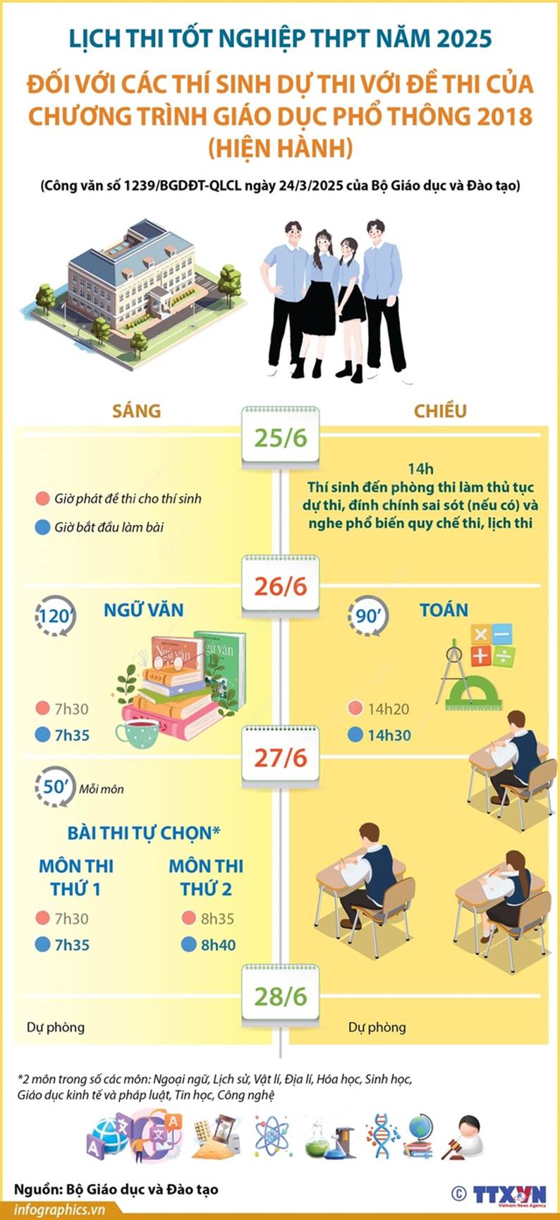 Theo đó, Kỳ thi tốt nghiệp THPT năm 2025 được tổ chức vào các ngày 25, 26, 27, 28/6/2025. Trong đó: Ngày 25/6/2025 làm thủ tục dự thi; ngày 26, 27/6/2025 tổ chức coi thi; ngày 28/6/2025 dự phòng.