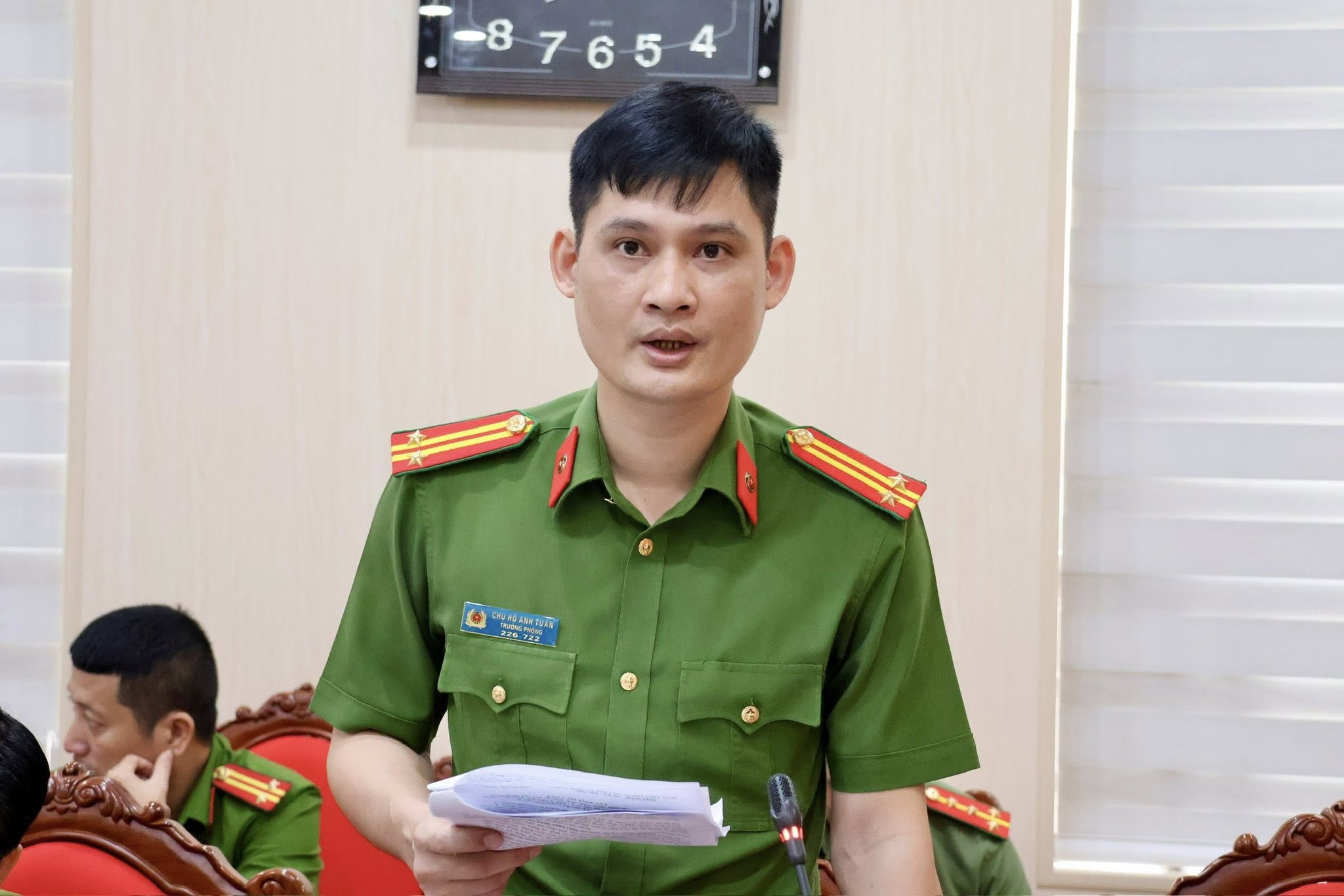 Trung tá Chu Hồ Anh Tuấn - Trưởng phòng Cảnh sát Thi hành án hình sự và hỗ trợ tư pháp (Công an tỉnh) phát biểu tại hội nghị.